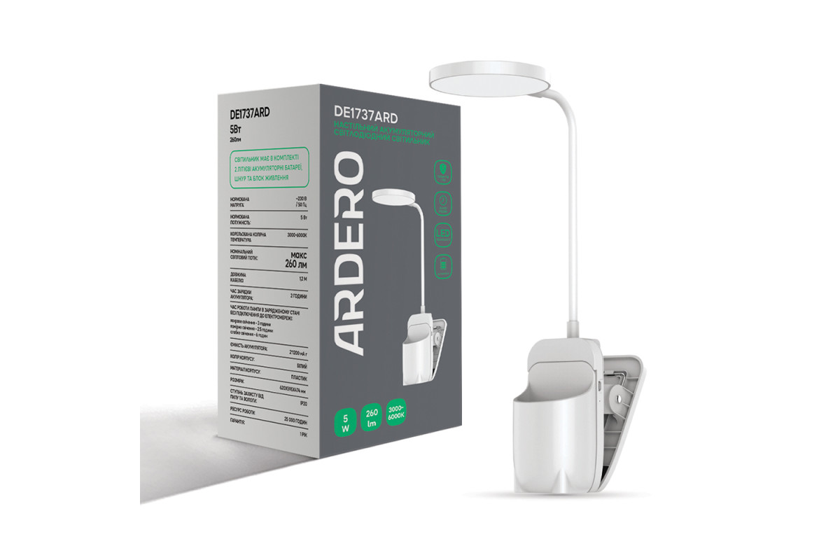 ❓ Хто виробник Акумуляторний світлодіодний настільний світильник Ardero DE1737ARD 5Вт білий?