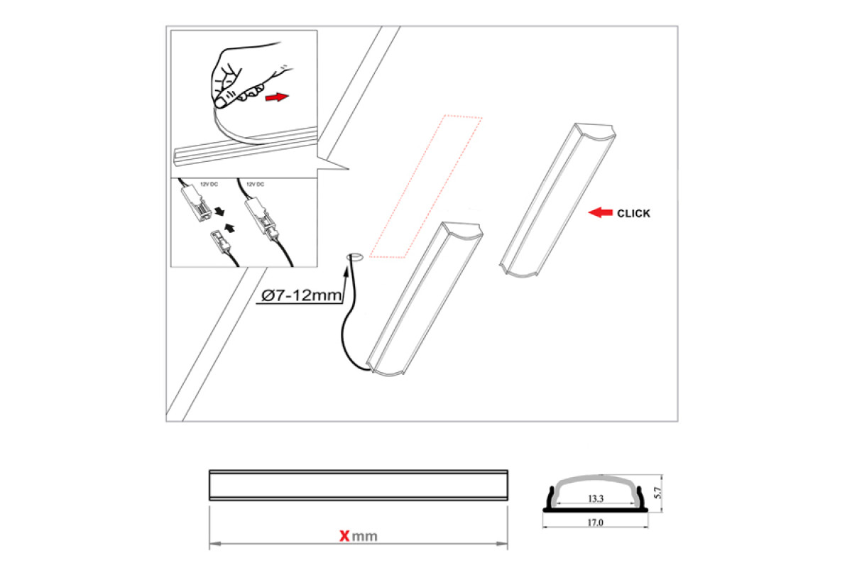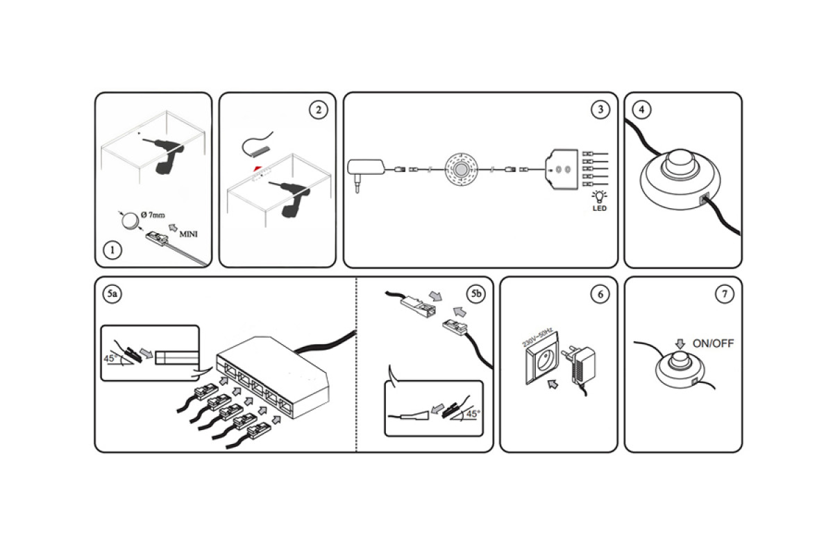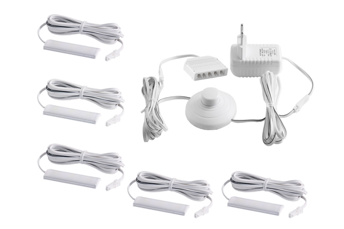 Комплект світильників світлодіодних з ножним вимикачем накладних для підсвітки меблевих полиць 5шт 220V біле світло білий провід LEDUA