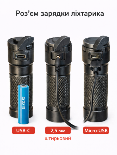 Під час вибору ліхтарика варто звертати увагу на тип розʼєму зарядки. Найбільш практичним варіантом є Type-C через його перевагу в універсальності — один і той самий кабель можна використовувати для зарядки телефону, павербанка і ліхтарика.