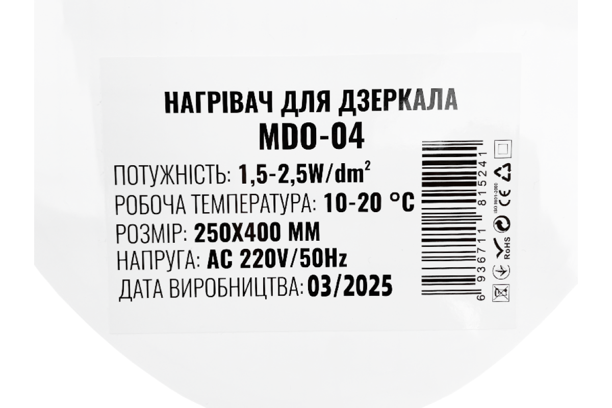 ❓ Хто виробник Нагрівальна плівка овальна для дзеркал (антизапотівання) MD0-04 250*400мм 220-240V?