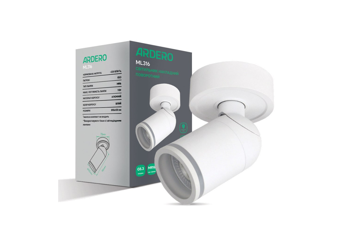 ❓ Як замовити Накладний поворотний світильник Ardero ML316 під лампу білий з доставкою?