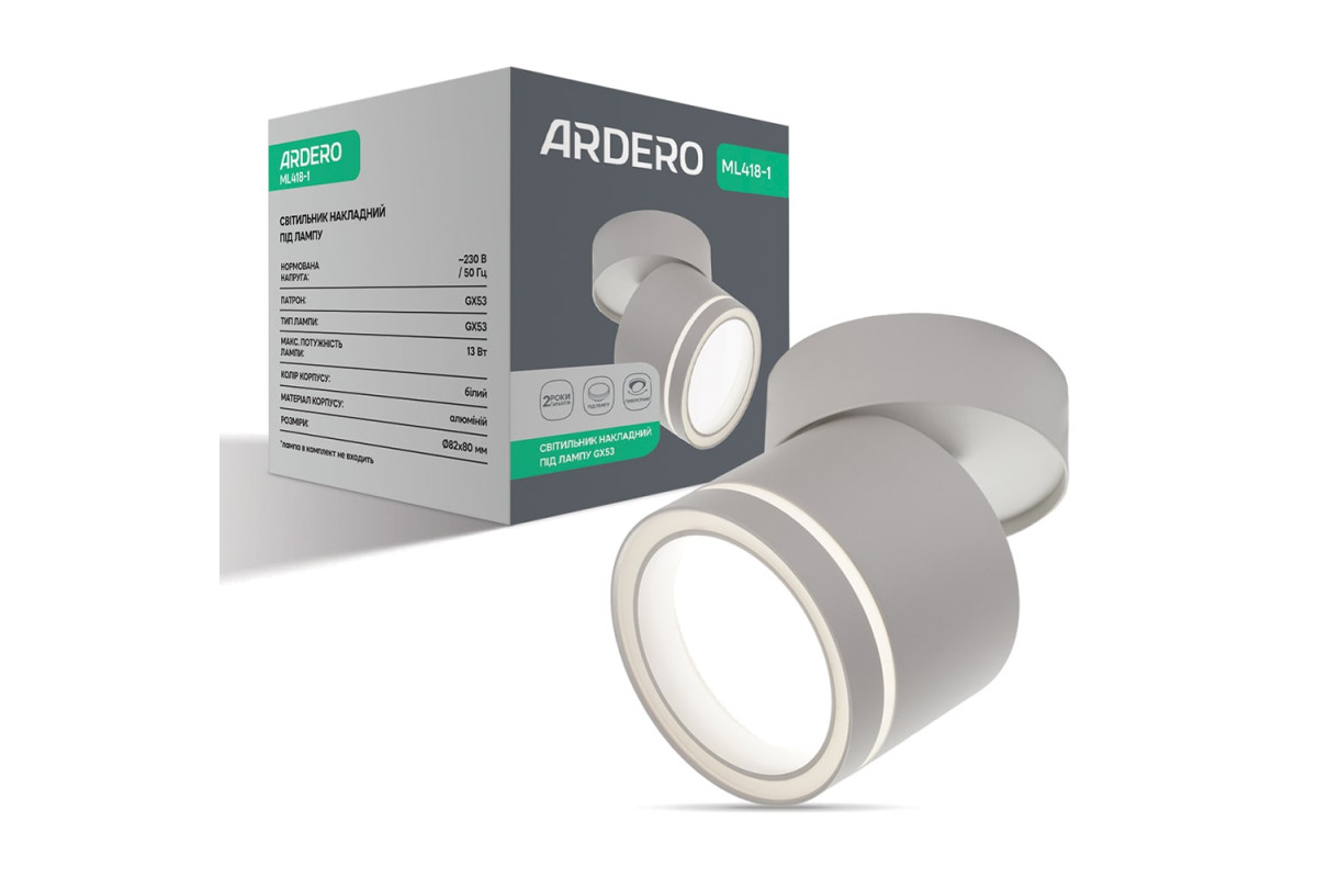 ❓ Хто виробник Накладний поворотний світильник Ardero ML418-1 під лампу білий?