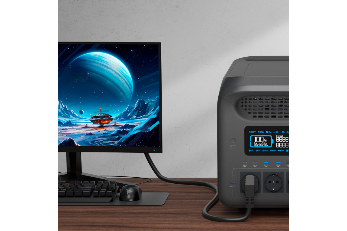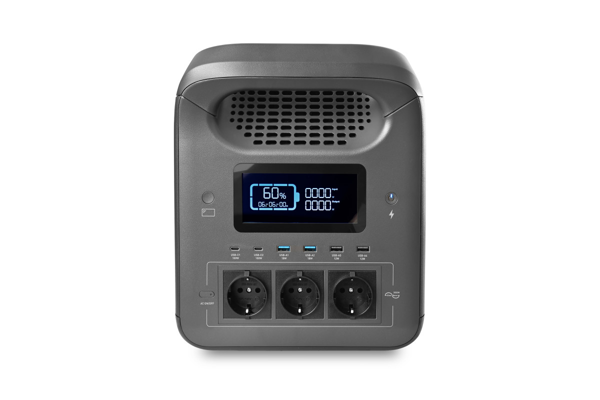 Має 3x розетки змінного струму (AC) (режим інвертора): Чиста синусоїда, загальна 1800Вт (пікова 3000Вт), напруга 220-240В, 50Гц/60Гц, 12A. В цьому режимі вихідна потужність змінного струму надходить від акумулятора, а не від мережі.