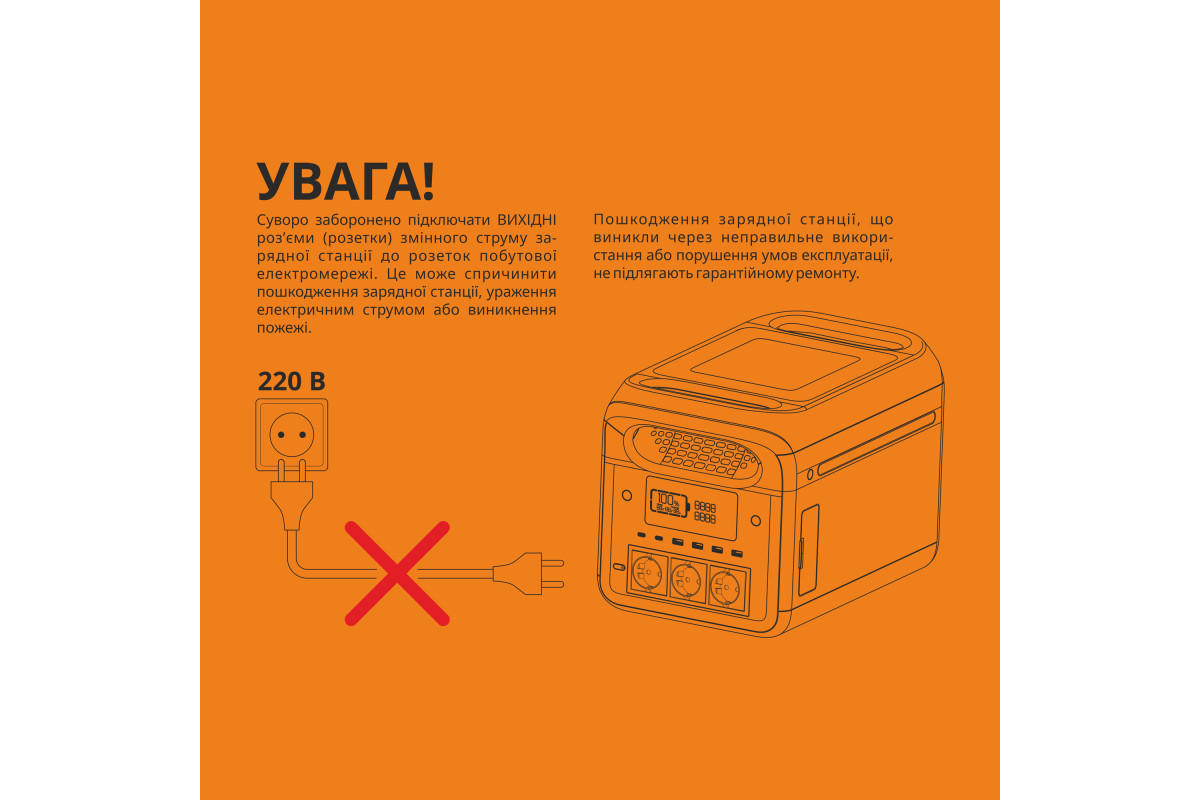 Розетки змінного струму (AC) (режим обхідної зарядки Bypass): напруга 220-240В, 50Гц/60Гц, 1800Вт Max., 10A Max. В цьому режимі вихідна потужність змінного струму надходить від мережі, а не від акумулятора.