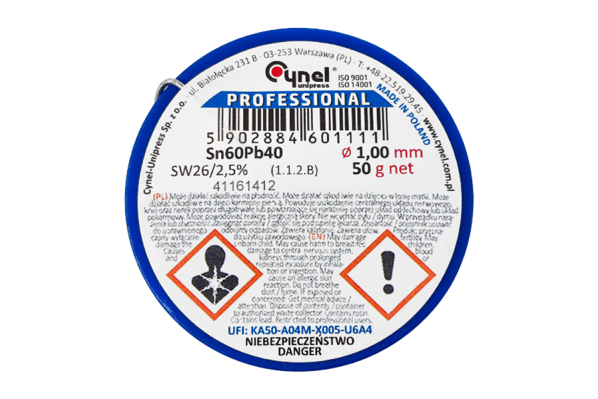 ❓ Хто виробник Припій Cynel Sn60Pb40-SW26, 1мм, 50г 13-0953?