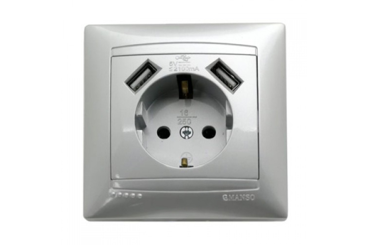 Розетка 1-на з заземленням + гніздо 2 USB LEMANSO Сакура срібло LMR1331