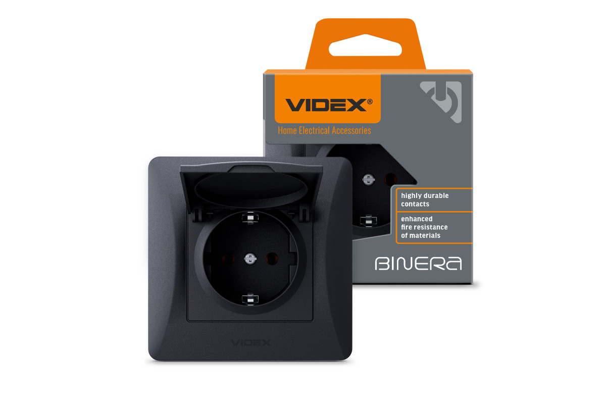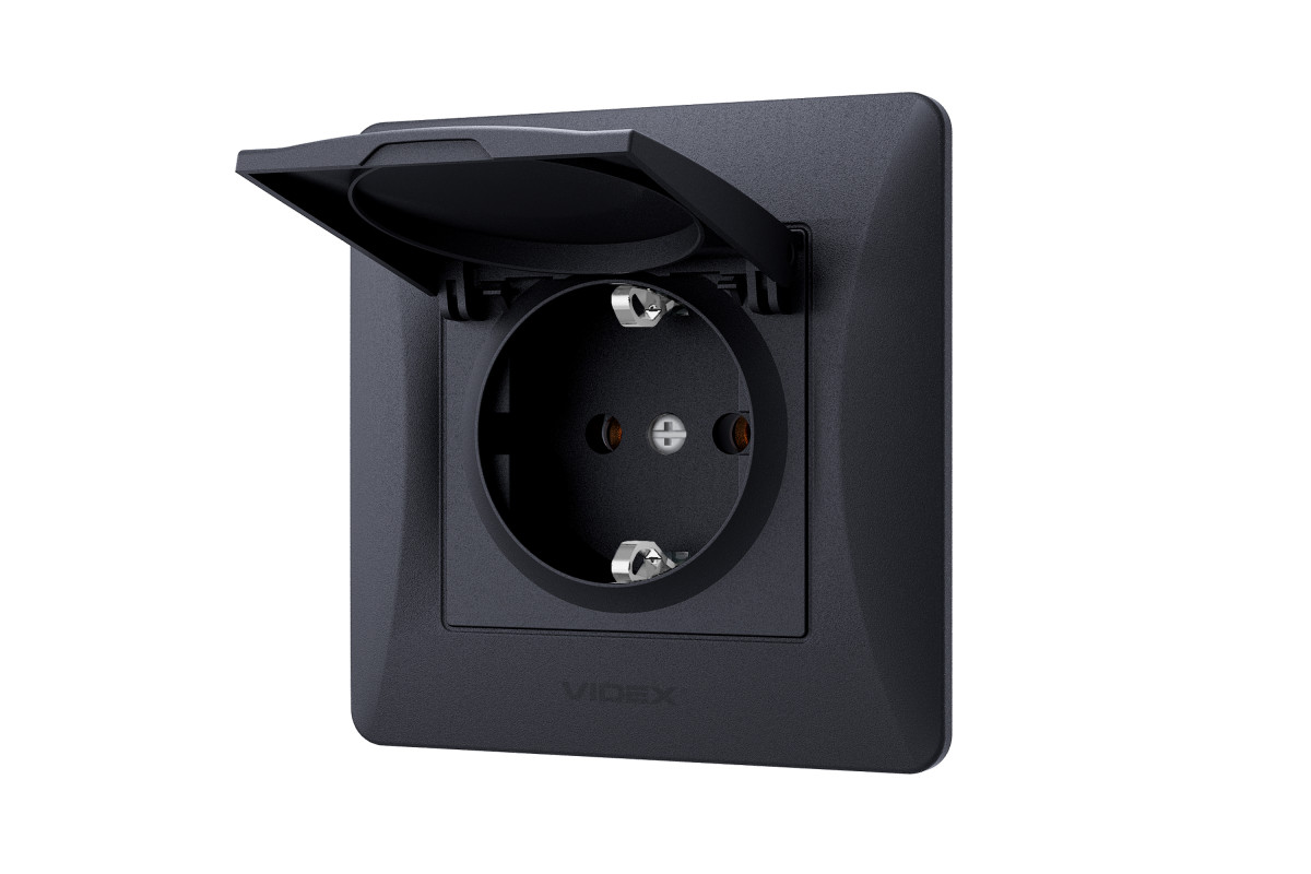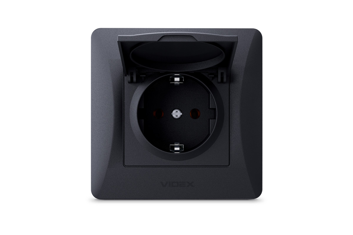 Розетка одинарна із заземленням та кришкою чорний графіт VIDEX BINERA