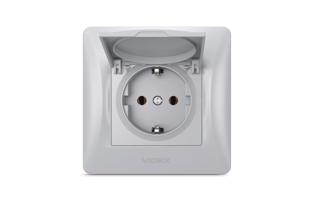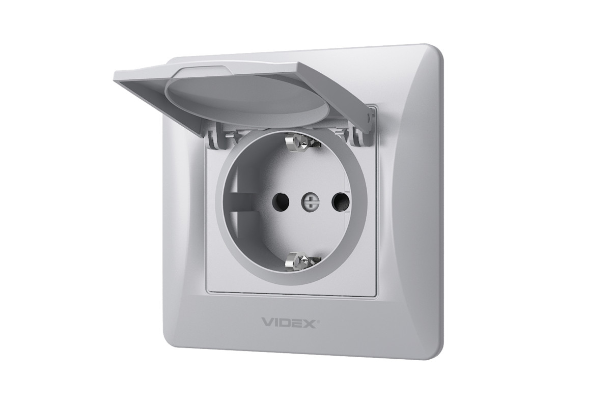 Розетка одинарна із заземленням та кришкою срібний шовк VIDEX BINERA