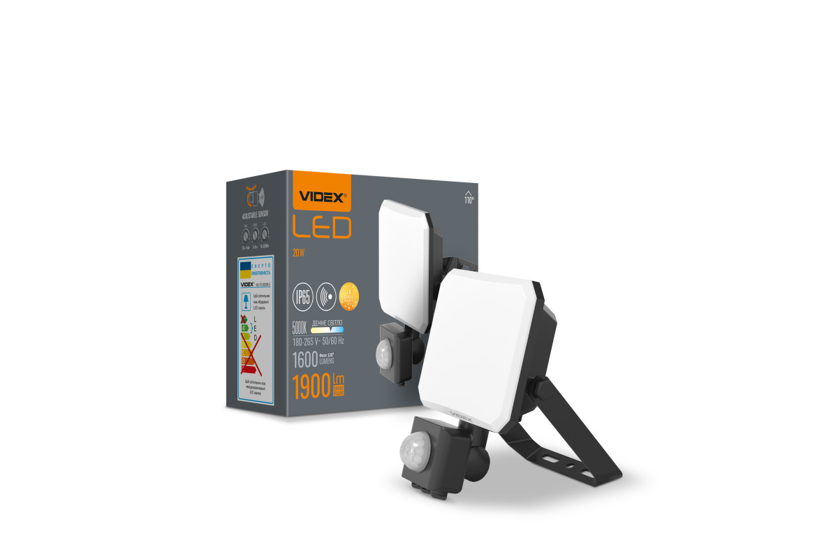 LED прожектор VIDEX F3 20W 5000K с датчиком движения 220V Black (VLE-F3-0205B-S)