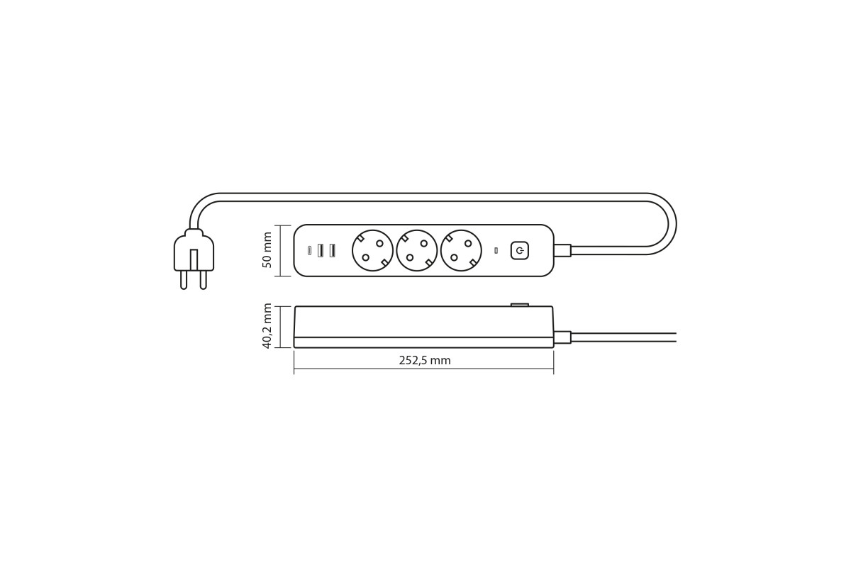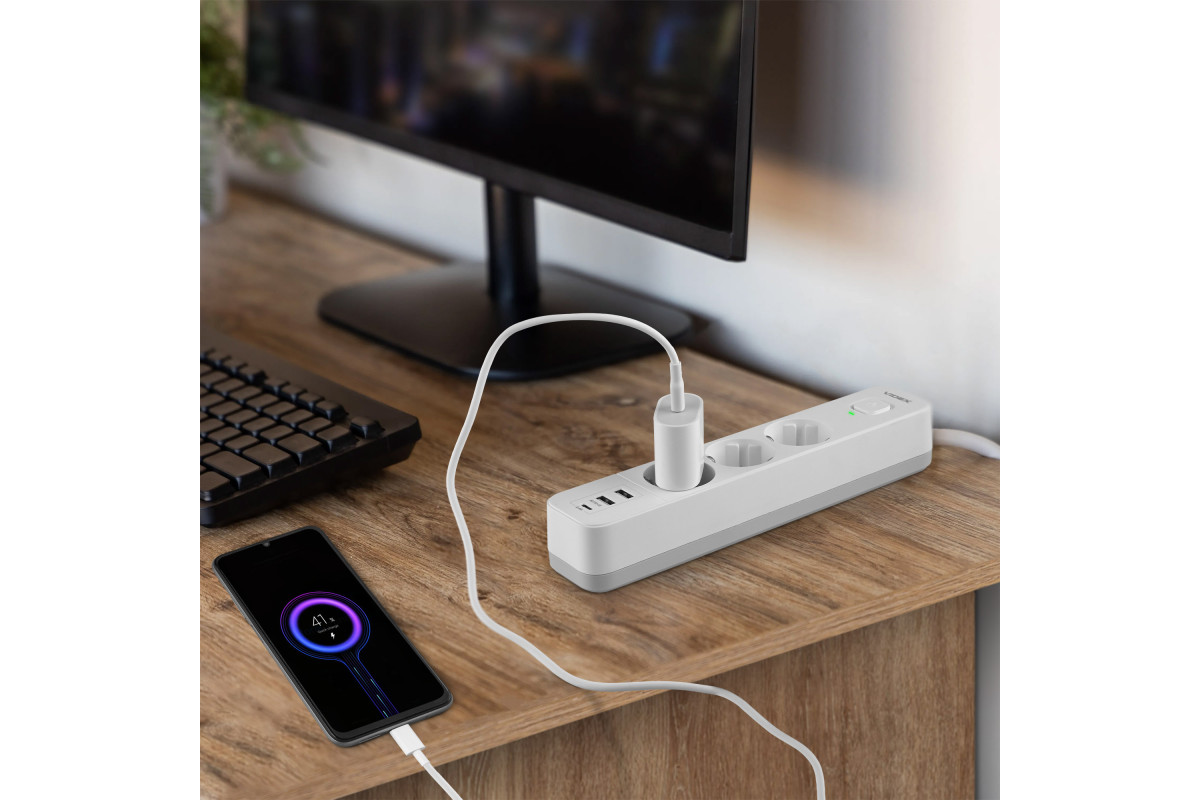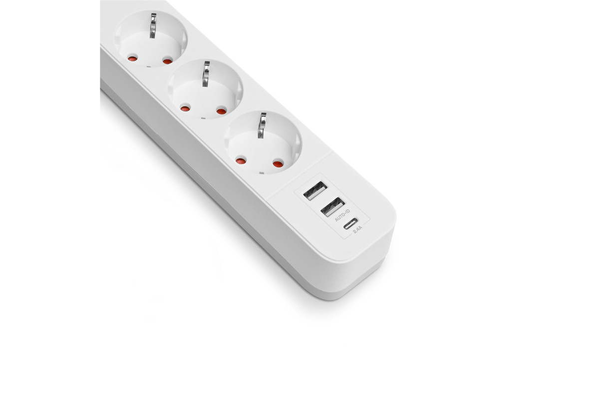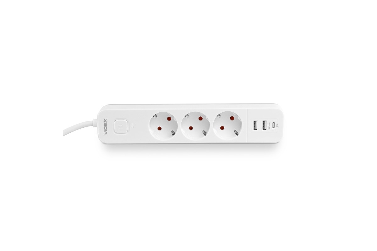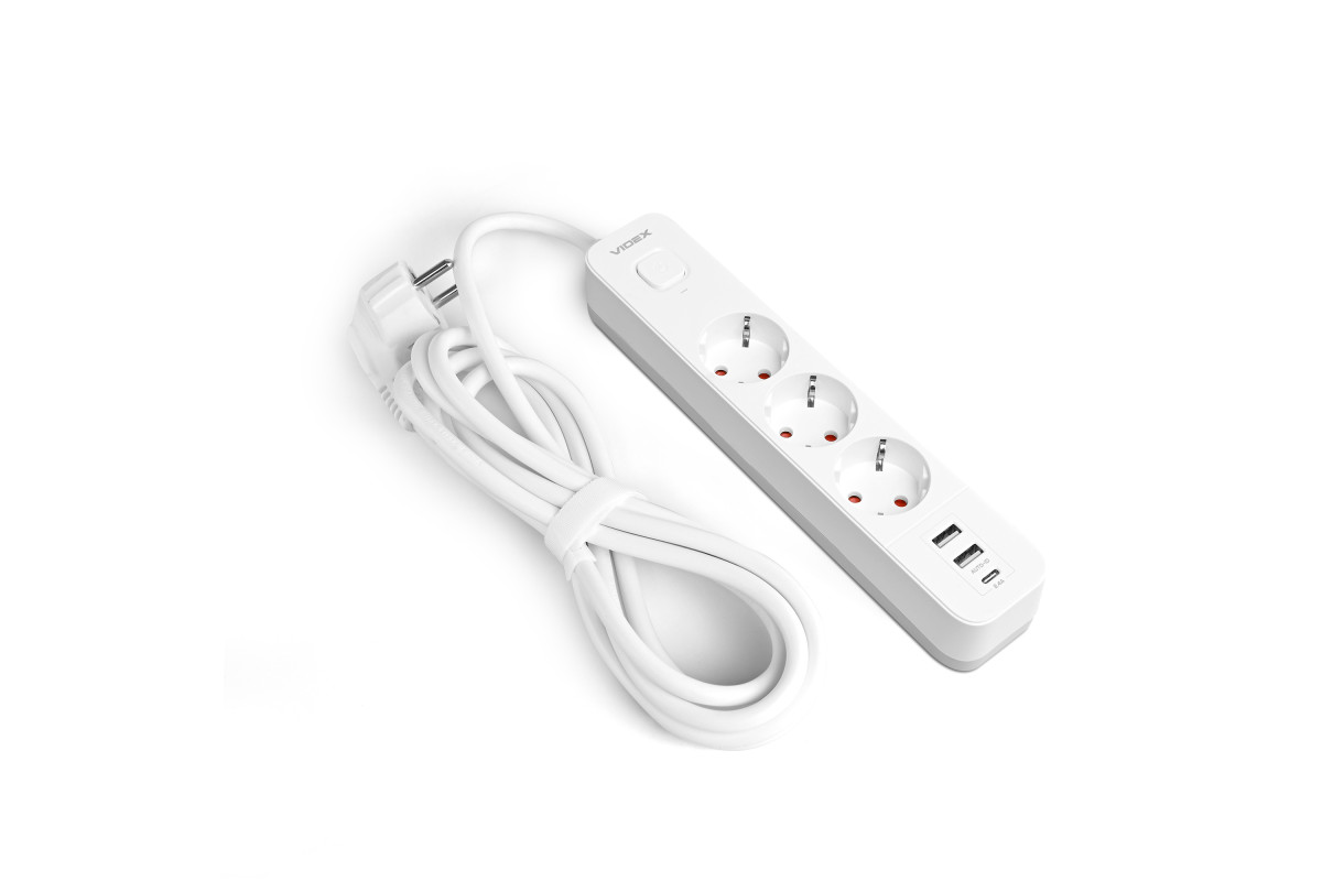 Мережевий подовжувач VIDEX ONCORD з/з 3п 3м (3x1.5мм) 2.4А 2USB+USB-C з кнопкою White
