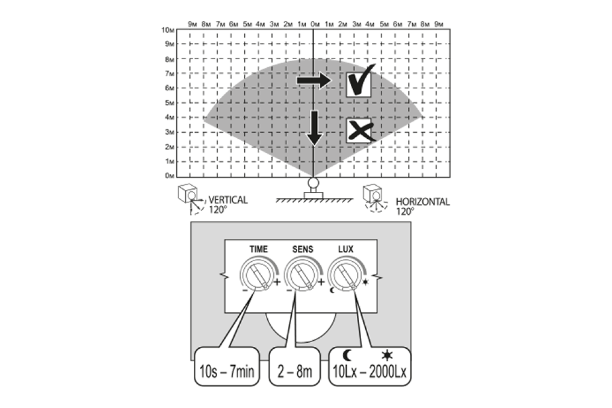 Время: 10 сек.- 7 мин.; Чувствительность: 2-8м; Освещенность: 10-2000 Люкс