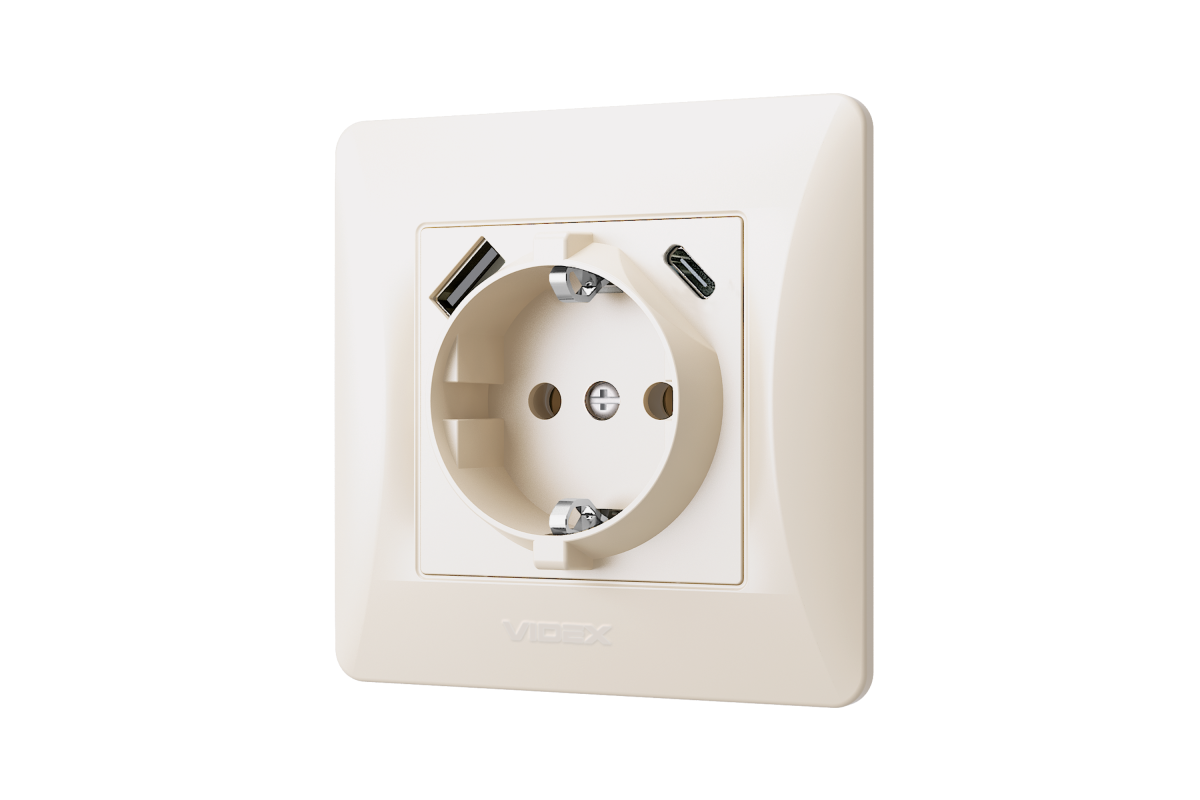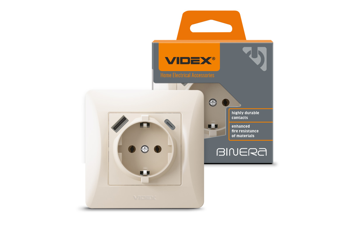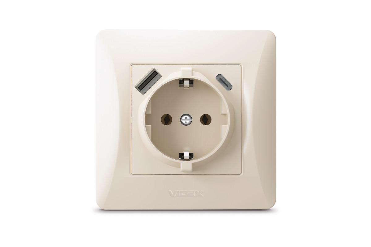 Розетка одинарная с заземлением из USB+USB-C кремовая VIDEX BINERA