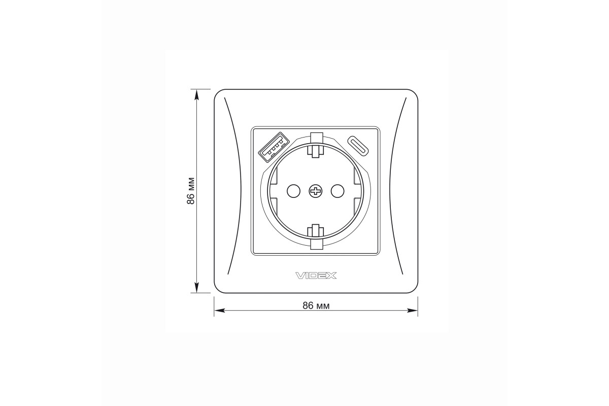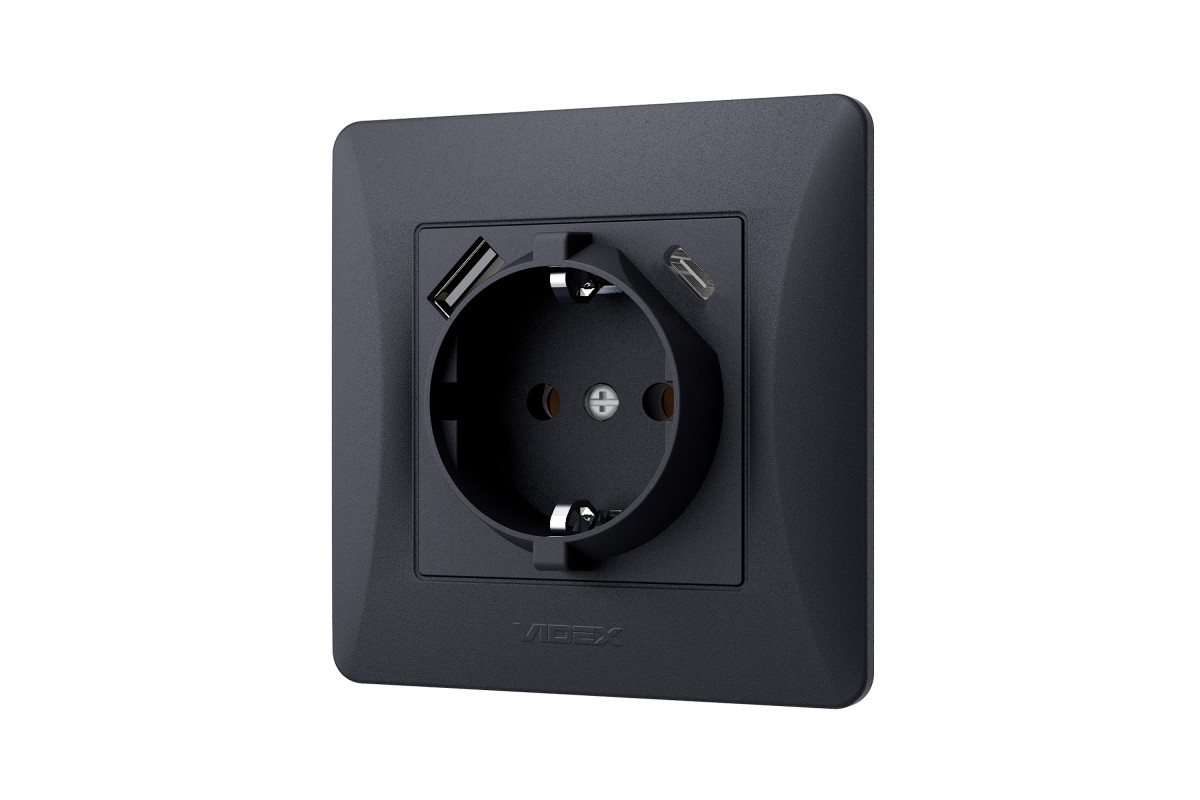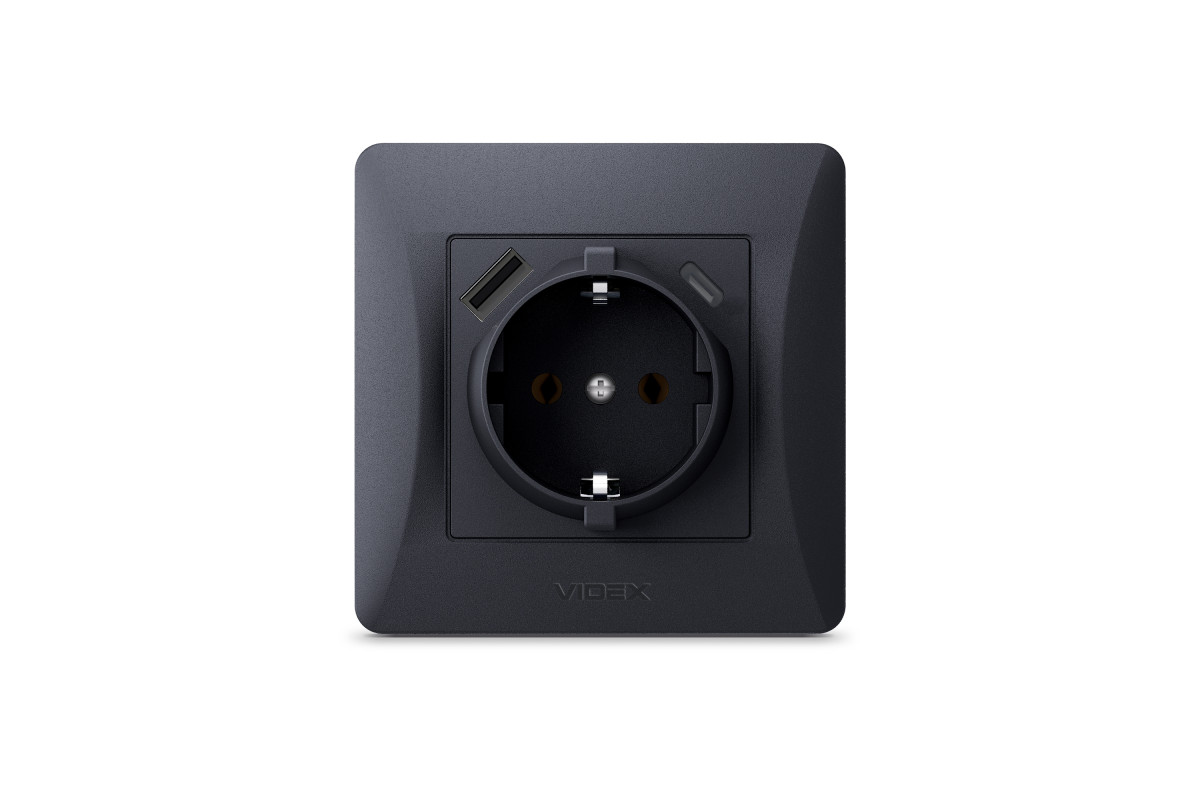 Розетка одинарная с заземлением с USB+USB-C черный графит VIDEX BINERA