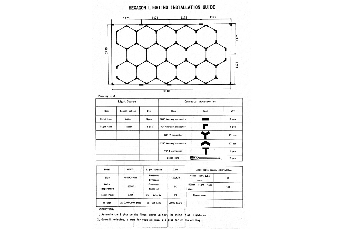 Светодиодный светильник шестиугольный 15HEXs 6000 K, 2430×4840 мм LEDUA