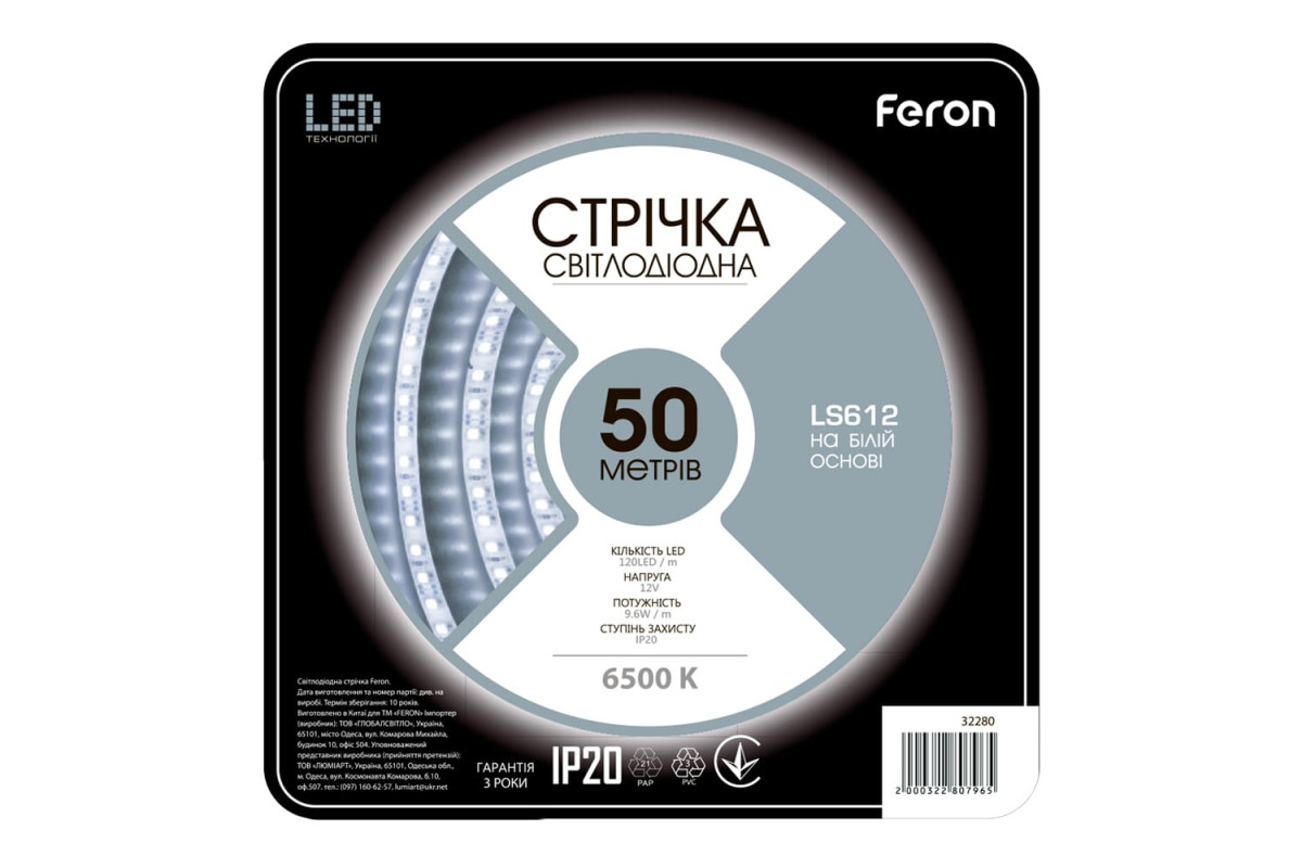 ❓ Хто виробник Світлодіодна стрічка Feron LS612 12В 9.6Вт/м 50м білий (5 м в бабіні)?