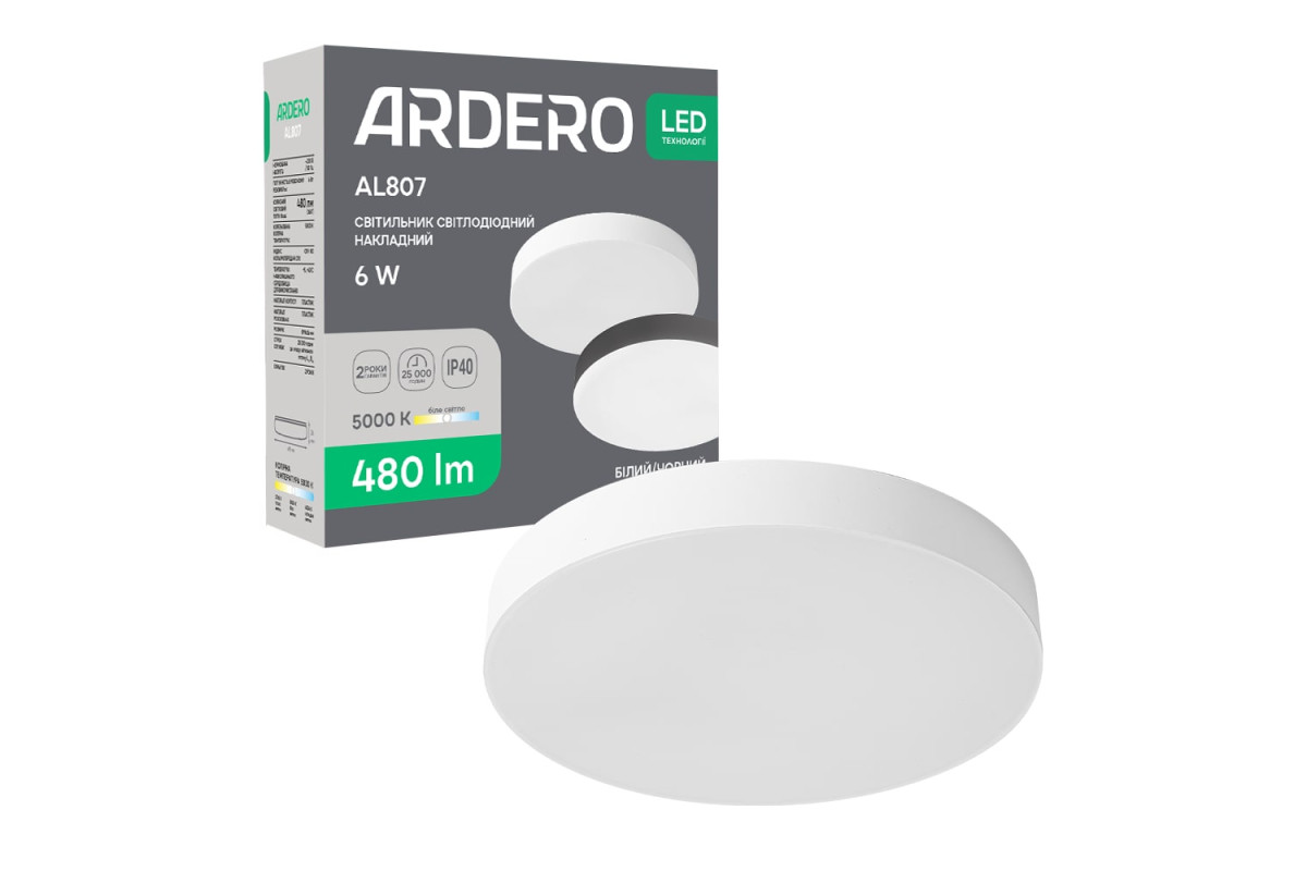 ❓ Яка ціна на Світлодіодний накладний світильник Ardero AL807 6Вт 5000K білий у 2026 році?