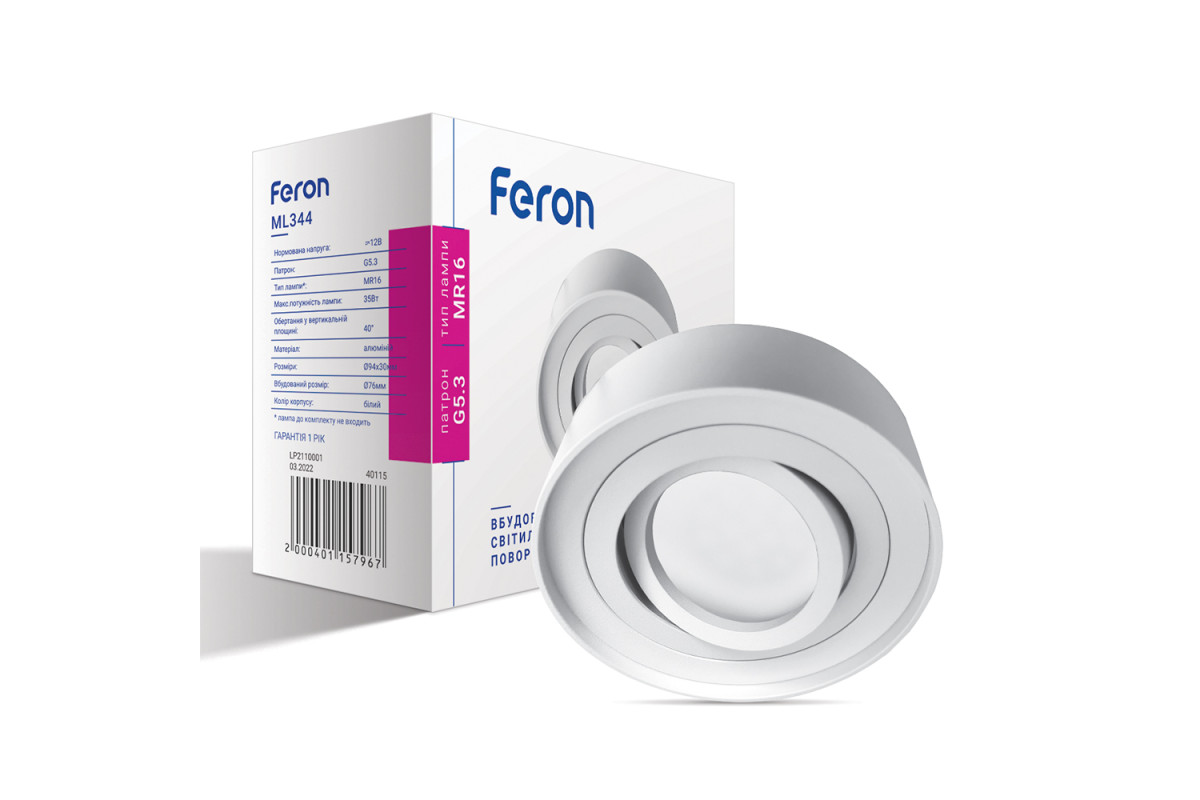 ❓ Хто виробник Вбудований поворотний світильник Feron ML344 під лампу білий?